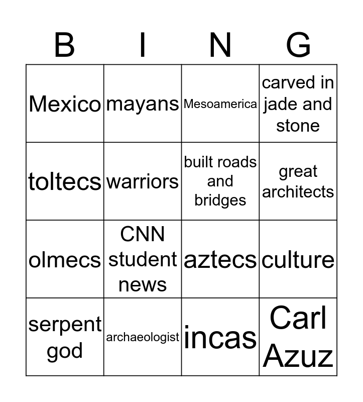 This bingo card has 16 words: archaeologist, culture, Mesoamerica, Mexico, olmecs, mayans, aztecs, incas, toltecs, warriors, serpent god, carved in jade and stone, CNN student news, great architects, built roads and bridges and Carl Azuz.
