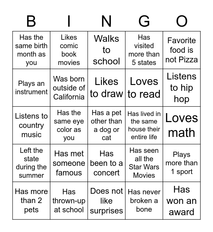 This bingo card has a free space and 29 words: Has ever been to a foreign country, Has thrown-up at school, Walks to school, Has more than 2 siblings, Favorite food is not Pizza, Has the same birth month as you, Was born outside of California, Likes to draw, Has lived in the same house their entire life, Plays more than 1 sport, Has more than 2 pets, Has the same eye color as you, Has never broken a bone, Has won an award, Listens to country music, Loves to dance, Does not like surprises, Has seen all the Star Wars Movies, Listens to hip hop, Left the state during the summer, Has met someone famous, Has tried sushi, Loves to read, Loves math, Plays an instrument, Likes comic book movies, Has been to a concert, Has visited more than 5 states and Has used power tools.
