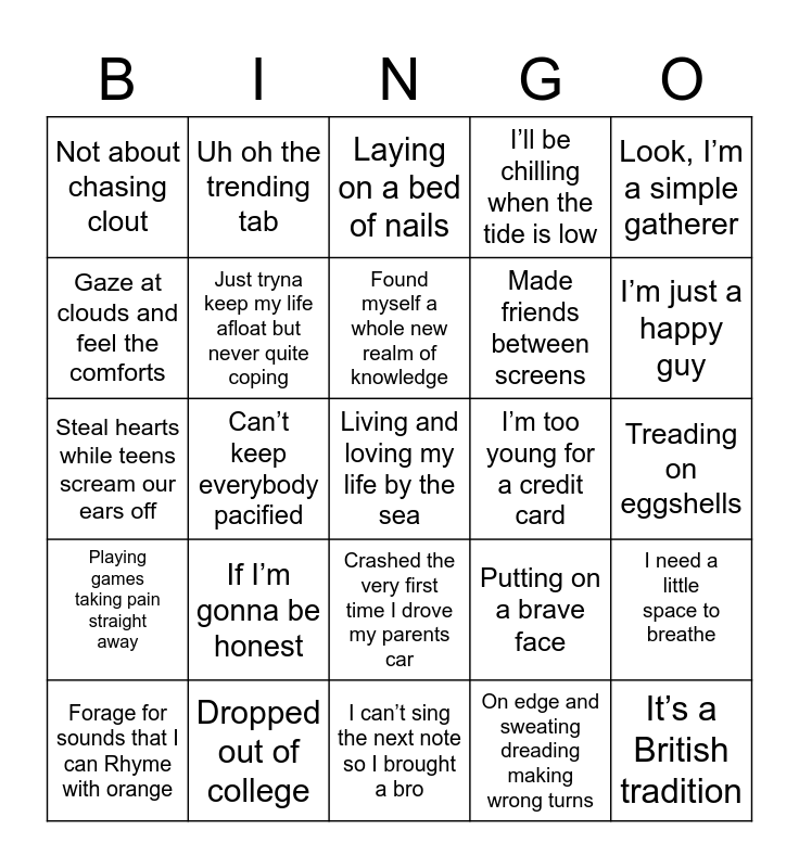 This bingo card has a free space and 24 words: If I’m gonna be honest, Dropped out of college, Found myself a whole new realm of knowledge, Forage for sounds that I can Rhyme with orange, Look, I’m a simple gatherer, Not about chasing clout, Gaze at clouds and feel the comforts, Uh oh the trending tab, I’m too young for a credit card, Crashed the very first time I drove my parents car, Made friends between screens, Steal hearts while teens scream our ears off, Putting on a brave face, I need a little space to breathe, Just tryna keep my life afloat but never quite coping, On edge and sweating dreading making wrong turns, Treading on eggshells, Laying on a bed of nails, I’m just a happy guy, Can’t keep everybody pacified, It’s a British tradition, Playing games taking pain straight away, I’ll be chilling when the tide is low and I can’t sing the next note so I brought a bro.