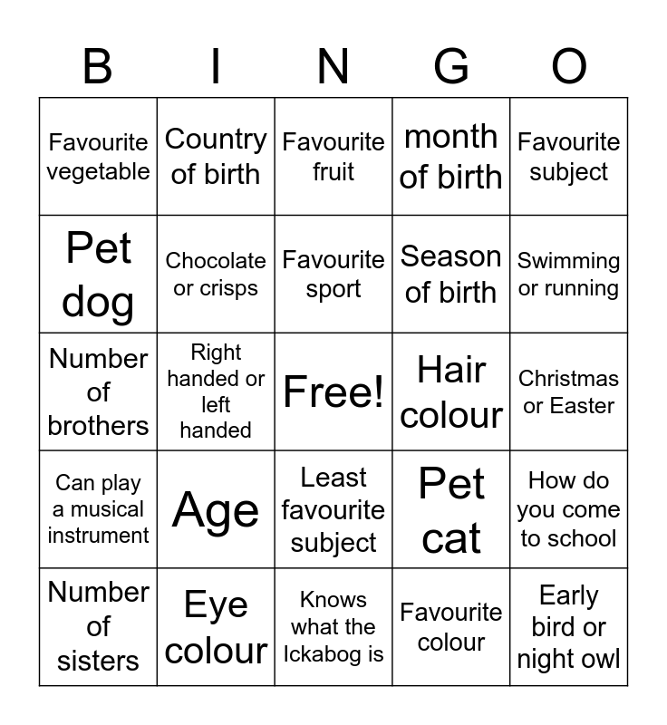 This bingo card has a free space and 24 words: Age, Eye colour, Favourite sport, Number of sisters, Favourite subject, Favourite vegetable, Pet dog, Country of birth, Hair colour, Least favourite subject, Season of birth, Number of brothers, Pet cat, How do you come to school, Chocolate or crisps, Favourite colour, Christmas or Easter, Favourite fruit, Swimming or running, Right handed or left handed, Early bird or night owl, Can play a musical instrument, month of birth and Knows what the Ickabog is.