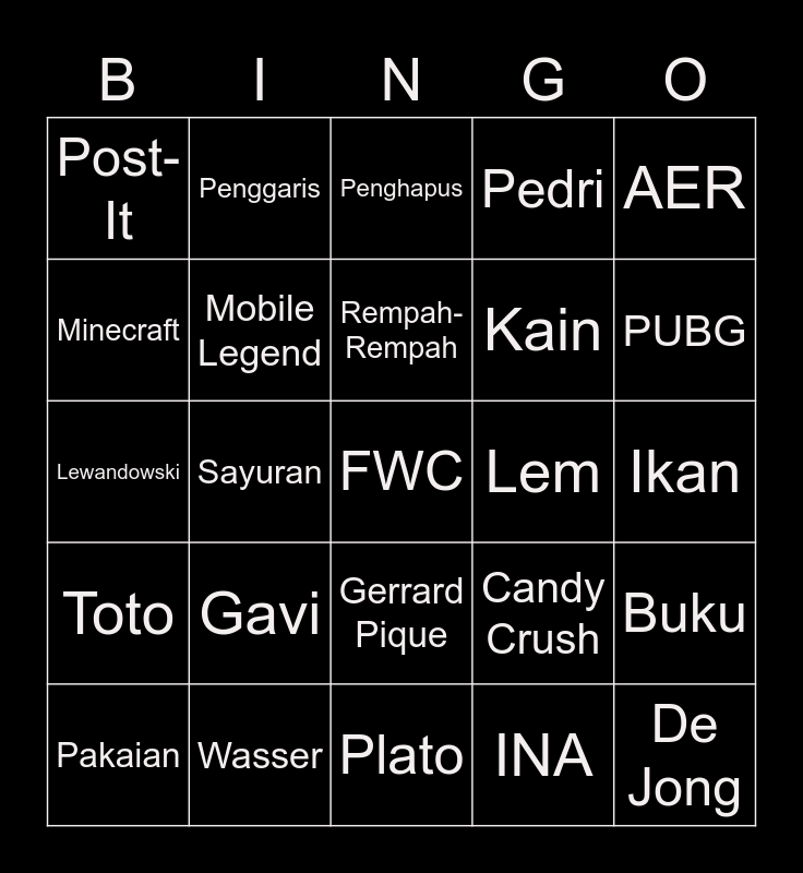 This bingo card has 25 words: Toto, Wasser, FWC, INA, AER, Post-It, Penggaris, Penghapus, Lem, Buku, Minecraft, Mobile Legend, Plato, Candy Crush, PUBG, Pakaian, Sayuran, Rempah-Rempah, Kain, Ikan, Lewandowski, Gavi, Gerrard Pique, Pedri and De Jong.