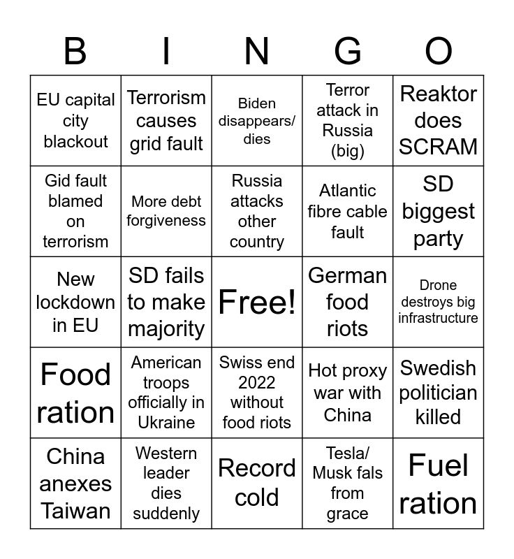 This bingo card has a free space and 24 words: American troops officially in Ukraine, Western leader dies suddenly, Russia attacks other country, China anexes Taiwan, Reaktor does SCRAM, EU capital city blackout, Gid fault blamed on terrorism, Terrorism causes grid fault, German food riots, Swiss end 2022 without food riots, Atlantic fibre cable fault, New lockdown in EU, Hot proxy war with China, Swedish politician killed, More debt forgiveness, Tesla/ Musk fals from grace, Drone destroys big infrastructure, Biden disappears/ dies, SD biggest party, SD fails to make majority, Fuel ration, Food ration, Terror attack in Russia (big) and Record cold.