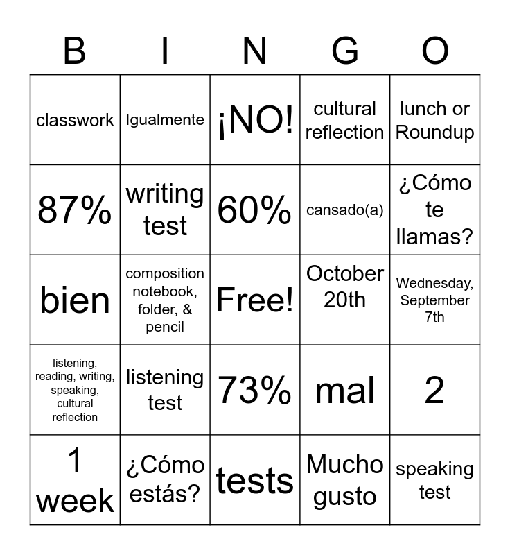 This bingo card has a free space and 37 words: 1 yr of high school credit, empathetic, 100%, writing test, 2, listening test, 60%, 10, lunch or Roundup, 50%, composition notebook, folder, & pencil, cultural reflection, speaking test, Wednesday, September 7th, 87%, listening, reading, writing, speaking, cultural reflection, reading test, ¡NO!, 73%, October 20th, classwork, ¿Cómo te llamas?, 1 week, tests, Me llamo, Mucho gusto, Igualmente, ¿Y tú?, Lo siento, Gracias, De nada, ¿Cómo estás?, bien, así así, mal, cansado(a) and nervioso(a).