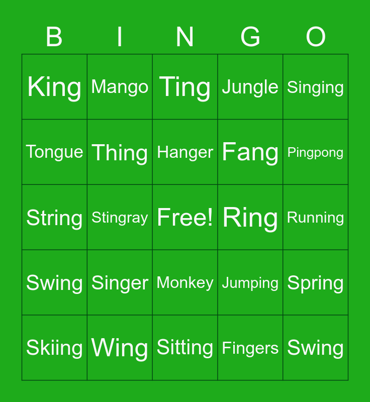 This bingo card has a free space and 24 words: Singer, Wing, Hanger, Skiing, Singing, King, Tongue, Mango, Ring, Monkey, Fang, String, Jumping, Spring, Thing, Fingers, Running, Ting, Pingpong, Stingray, Swing, Swing, Jungle and Sitting.