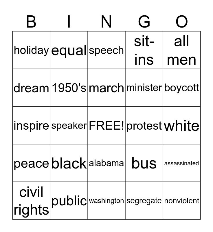 This bingo card has a free space and 24 words: black, public, march, civil rights, all men, holiday, dream, equal, protest, alabama, minister, inspire, bus, assassinated, 1950's, segregate, white, speech, boycott, speaker, nonviolent, peace, sit-ins and washington.