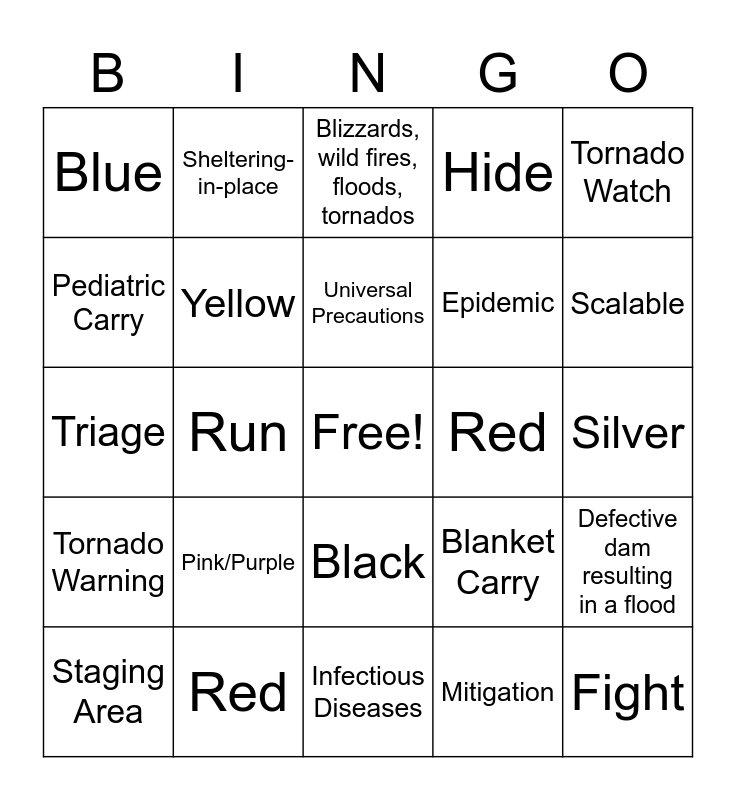 This bingo card has a free space and 41 words: Strategic Nation Stockpile, Triage, Green, Yellow, Red, Black, Universal Precautions, Bomb Threat, Tornado Watch, Tornado Warning, Run, Hide, Fight, Silver, Red, Pink/Purple, Black, Blue, All Hazards Preparation, Blizzards, wild fires, floods, tornados, Defective dam resulting in a flood, Explosions, infrastructure accidents, terrorism, Infectious Diseases, Epidemic, Pandemic, Go Bag, Mitigation, Response, Scalable, Recovery, 2, Sheltering-in-place, Staging Area, Patient Medical Records, Blanket Carry, Pediatric Carry, Safe Zone, Safety, Decontamination Area, Incident Command Site and Point of Distribution Site.