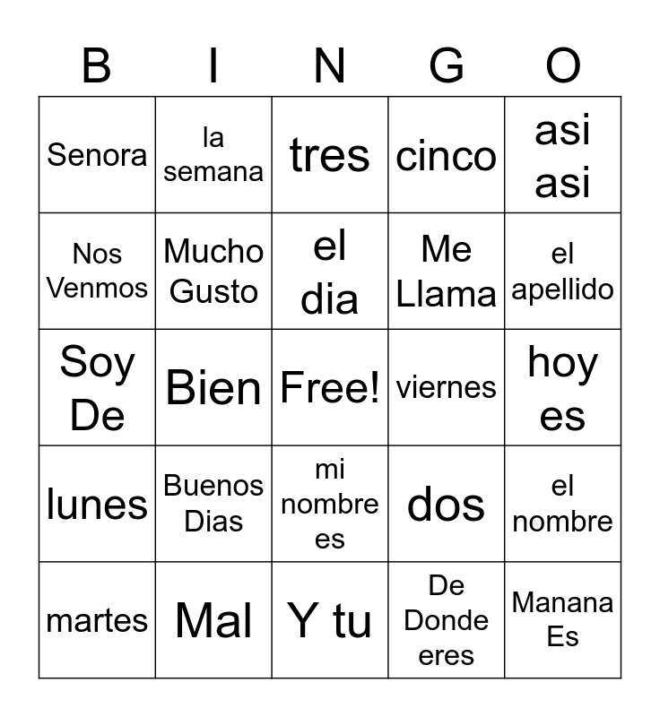 This bingo card has a free space and 24 words: Buenos Dias, Mal, el dia, martes, asi asi, Senora, Nos Venmos, la semana, viernes, mi nombre es, Me Llama, Soy De, dos, el nombre, Mucho Gusto, De Donde eres, hoy es, tres, el apellido, Bien, Manana Es, lunes, cinco and Y tu.