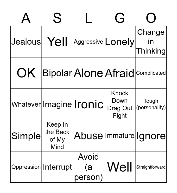 This bingo card has 30 words: Interrupt, Urge, Imagine, Soft Hearted, Jealous, Aggressive, Bipolar, Abuse, Knock Down Drag Out Fight, Avoid (a person), Tough (personality), Ironic, Well, Straightforward, Complicated, Processing, Immature, Simple, Keep In the Back of My Mind, Change in Thinking, Whatever, Won't, Yell, Afraid, OK, Lonely, Ignore, Oppression, Alone and Guilty.