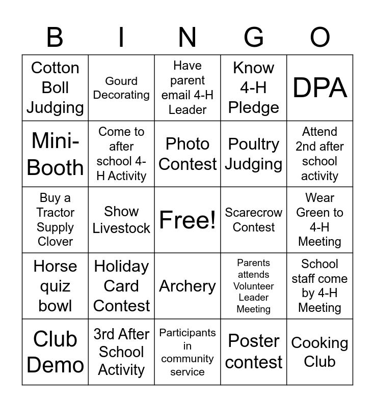 This bingo card has a free space and 24 words: Holiday Card Contest, 3rd After School Activity, Photo Contest, Club Demo, DPA, Cotton Boll Judging, Mini-Booth, Gourd Decorating, Scarecrow Contest, Archery, Poultry Judging, Buy a Tractor Supply Clover, Parents attends Volunteer Leader Meeting, School staff come by 4-H Meeting, Come to after school 4-H Activity, Poster contest, Wear Green to 4-H Meeting, Have parent email 4-H Leader, Attend 2nd after school activity, Show Livestock, Cooking Club, Horse quiz bowl, Know 4-H Pledge and Participants in community service.