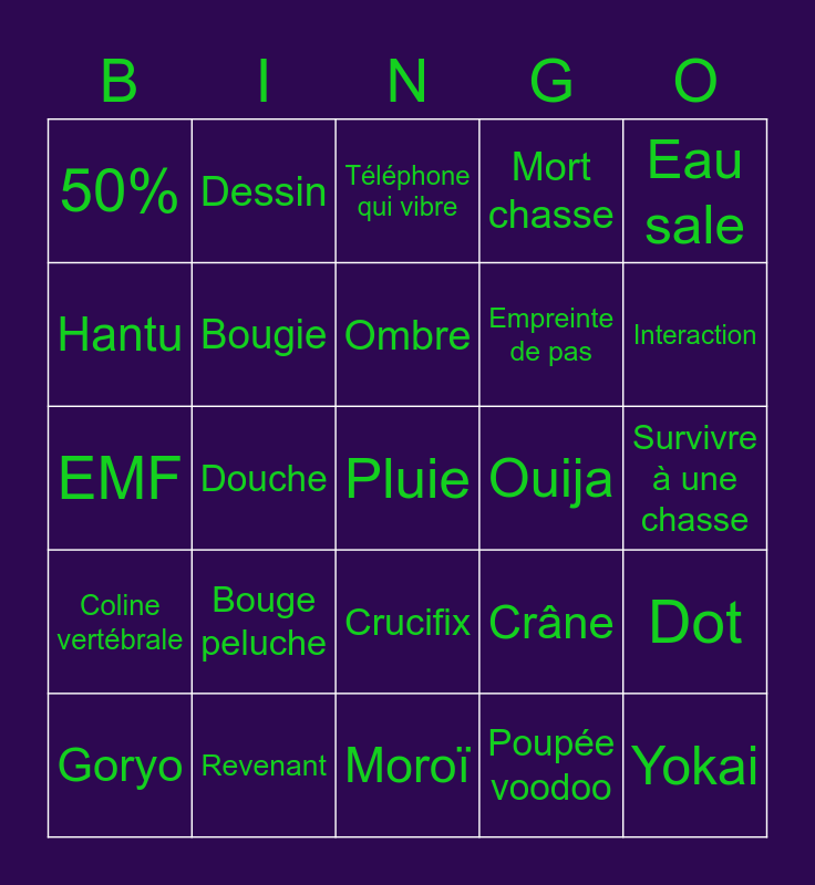 This bingo card has 90 words: Deogen, Spirit box, Téléphone qui vibre, Tanglewood, 25%, Esprit, Miroir, Moroï, Poupée voodoo, Tout nu, Free, Appareil électronique, Free!, Empreinte de pas, Empreinte digitales, EMF, Cri, Lumière rouge, Event, Willow, Old, Young, Ombre, Orbe, Dot, Poltergeist, Fantôme, Spectre, Tayhe, Os, Obske, Breaker, Boîte à musique, Ouija, Eau sale, 50%, Dessin, Livre fantomatique, Mort chasse, Survivre à une chasse, Salle de bain, Douche, Garage, Crâne, Fémur, Goryo, Lumière explose, Demon, Cauchemar, Grafton, Mimic, Bouge peluche, Bouge ballon, Ferme/ouvre les lumières, Touche à une porte, Voiture, Cave, Pluie, Yurei, Yokai, Banshee, ObAke, Cercle, Ridgeview, Piano, Ventilateur, Neige, Pluie, Oni, Finir tarot, Coline vertébrale, Revenant, Crucifix, Jumeaux, Interaction, Hantu, Jinn, Myling, Raiju, Edgefield, Encens, Bougie, Sel, Det. Mouvement, Chambre, Mannequin tp, Game parfaite, Souffle, Rire and Sadako.