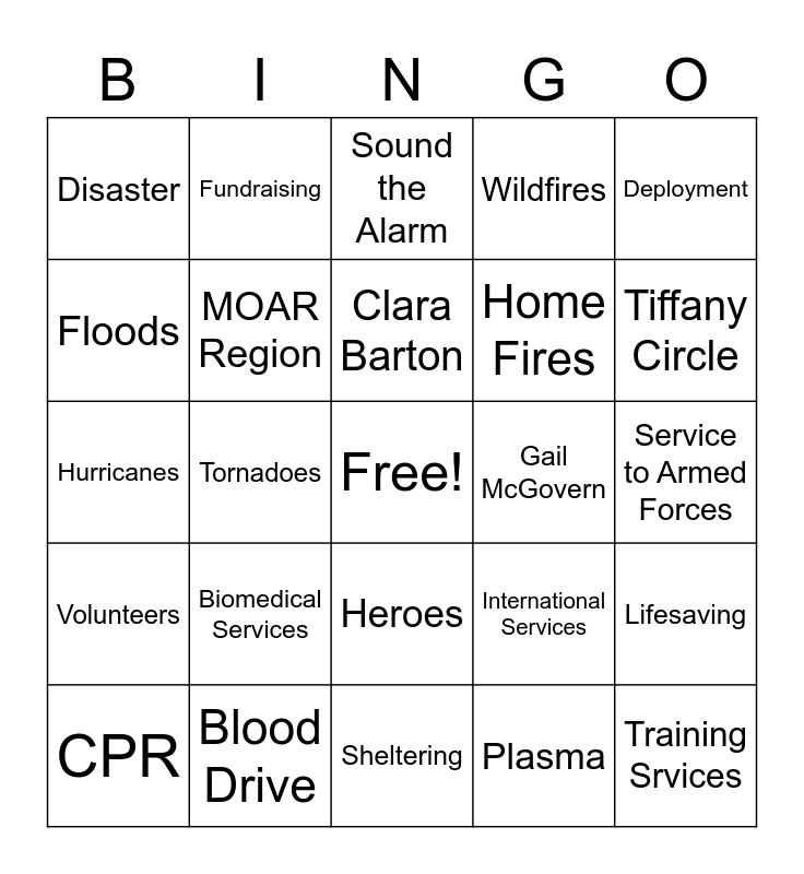 This bingo card has a free space and 24 words: Biomedical Services, Blood Drive, Clara Barton, CPR, Deployment, Disaster, Floods, Fundraising, Gail McGovern, Heroes, Home Fires, Hurricanes, International Services, Lifesaving, MOAR Region, Plasma, Service to Armed Forces, Sound the Alarm, Tiffany Circle, Tornadoes, Training Srvices, Volunteers, Wildfires and Sheltering.