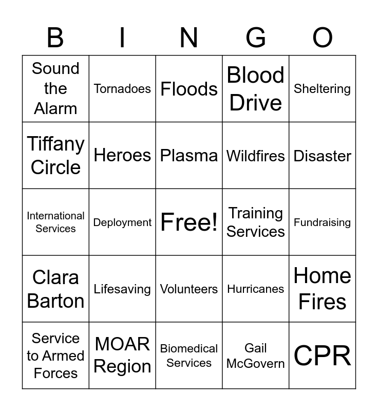 This bingo card has a free space and 24 words: Lifesaving, MOAR Region, Plasma, Service to Armed Forces, Sheltering, Sound the Alarm, Tiffany Circle, Tornadoes, Training Services, Volunteers, Wildfires, International Services, Hurricanes, Home Fires, Heroes, Gail McGovern, Fundraising, Floods, Disaster, Deployment, CPR, Clara Barton, Blood Drive and Biomedical Services.