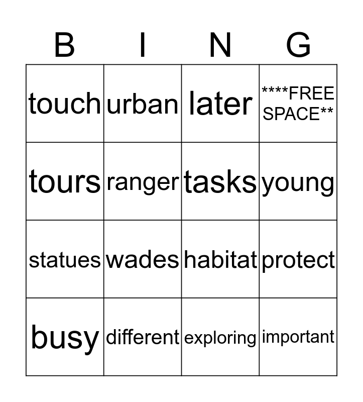 This bingo card has a free space and 15 words: busy, important, later, touch, young, tours, wades, exploring, ranger, statues, protect, ****FREE SPACE**, tasks, urban and different.