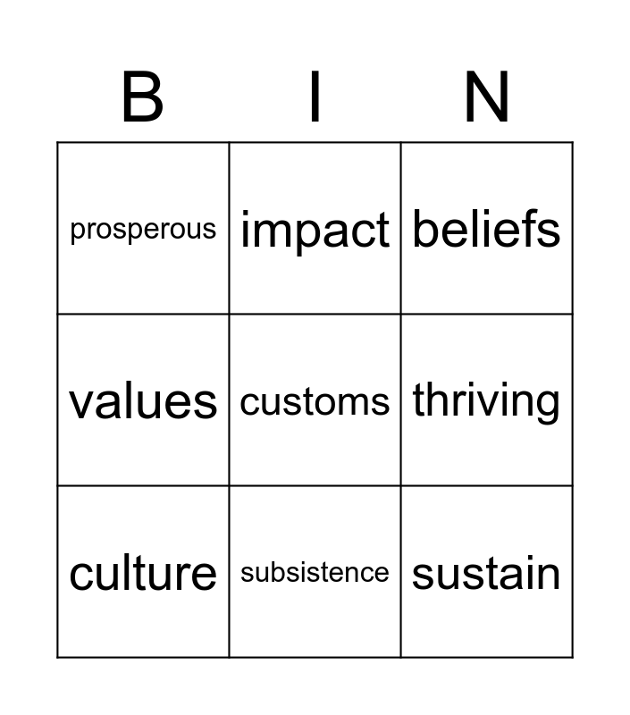 This bingo card has a free space and 9 words: culture, beliefs, impact, values, prosperous, thriving, sustain, homeland and subsistence.
