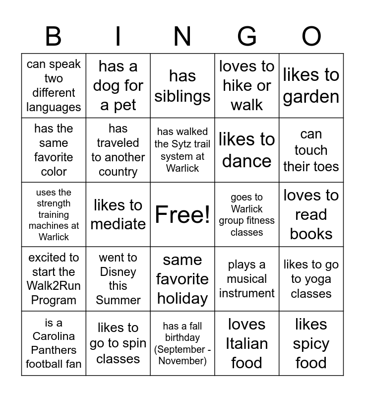 This bingo card has a free space and 24 words: is a Carolina Panthers football fan, went to Disney this Summer, has walked the Sytz trail system at Warlick, loves Italian food, likes to garden, can speak two different languages, has a dog for a pet, has siblings, goes to Warlick group fitness classes, loves to read books, uses the strength training machines at Warlick, has traveled to another country, plays a musical instrument, likes to go to yoga classes, has the same favorite color, likes to go to spin classes, has a fall birthday (September - November), loves to hike or walk, can touch their toes, excited to start the Walk2Run Program, likes to mediate, same favorite holiday, likes to dance and likes spicy food.