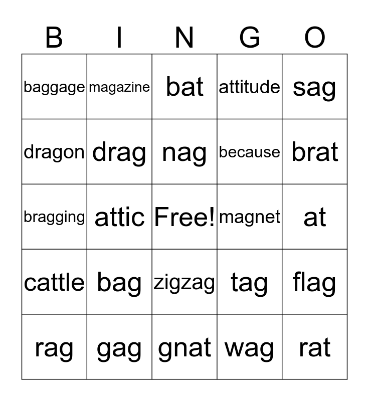 This bingo card has a free space and 24 words: bag, gag, nag, rag, sag, baggage, dragon, magazine, magnet, zigzag, because, bragging, tag, flag, drag, wag, at, bat, brat, attic, rat, cattle, attitude and gnat.
