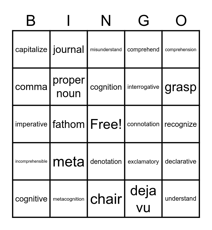 This bingo card has a free space and 24 words: meta, metacognition, cognition, cognitive, comprehension, capitalize, comma, journal, connotation, denotation, interrogative, imperative, exclamatory, declarative, proper noun, deja vu, recognize, misunderstand, grasp, fathom, understand, incomprehensible, comprehend and chair.