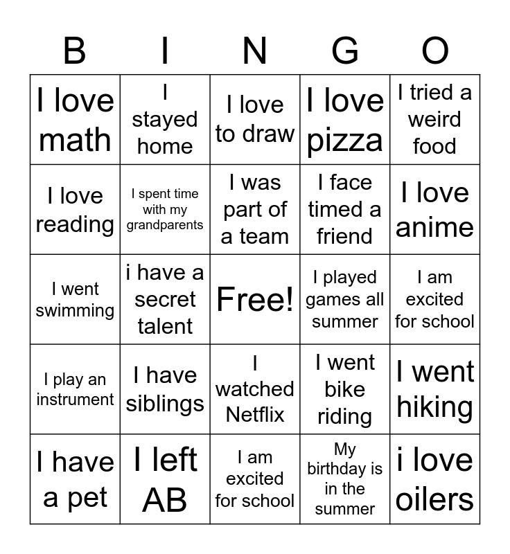 This bingo card has a free space and 24 words: I have siblings, I left AB, I was part of a team, I have a pet, I tried a weird food, I love math, I love reading, I stayed home, I played games all summer, I watched Netflix, I face timed a friend, I went swimming, I went bike riding, I went hiking, I spent time with my grandparents, My birthday is in the summer, I am excited for school, I love to draw, I love anime, i have a secret talent, i love oilers, I play an instrument, I love pizza and I am excited for school.