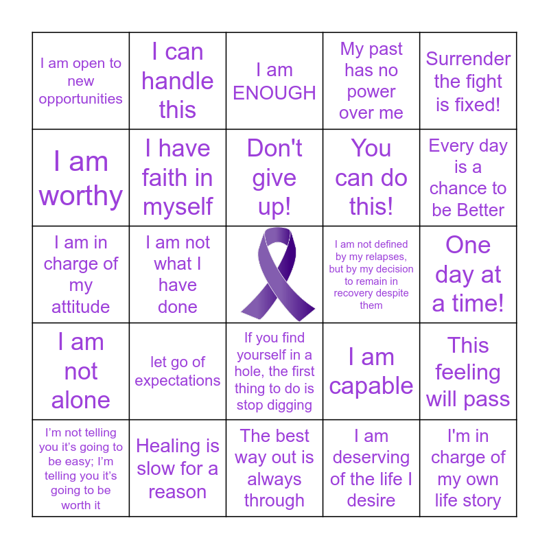 This bingo card has a free space and 30 words: Healing is slow for a reason, Recovering is hard. Regret is harder, I am not what I have done, Difficult roads lead to beautiful destinations, I am open to new opportunities, I am ENOUGH, I have faith in myself, If you find yourself in a hole, the first thing to do is stop digging, I am not defined by my relapses, but by my decision to remain in recovery despite them, The best way out is always through, One day at a time!, I'm in charge of my own life story, I am deserving of the life I desire, It's okay to set boundaries, Every day is a chance to be Better, My recovery must come first so that everything I love in life doesn’t have to come last, I am capable, I am not alone, let go of expectations, Surrender the fight is fixed!, I am in charge of my attitude, I am transforming, I can handle this, You can do this!, I am worthy, My past has no power over me, This feeling will pass, I’m not telling you it’s going to be easy; I’m telling you it’s going to be worth it, Don't give up! and Recovery is about progression not perfection.