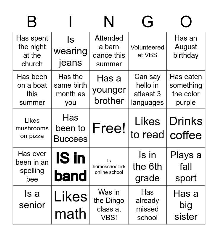 This bingo card has a free space and 24 words: IS in band, Likes math, Has a younger brother, Is a senior, Has an August birthday, Has spent the night at the church, Has been on a boat this summer, Is wearing jeans, Likes to read, Is homeschooled/ online school, Can say hello in atleast 3 languages, Likes mushrooms on pizza, Is in the 6th grade, Plays a fall sport, Has the same birth month as you, Has already missed school, Drinks coffee, Attended a barn dance this summer, Has eaten something the color purple, Has been to Buccees, Has a big sister, Has ever been in an spelling bee, Volunteered at VBS and Was in the Dingo class at VBS!.