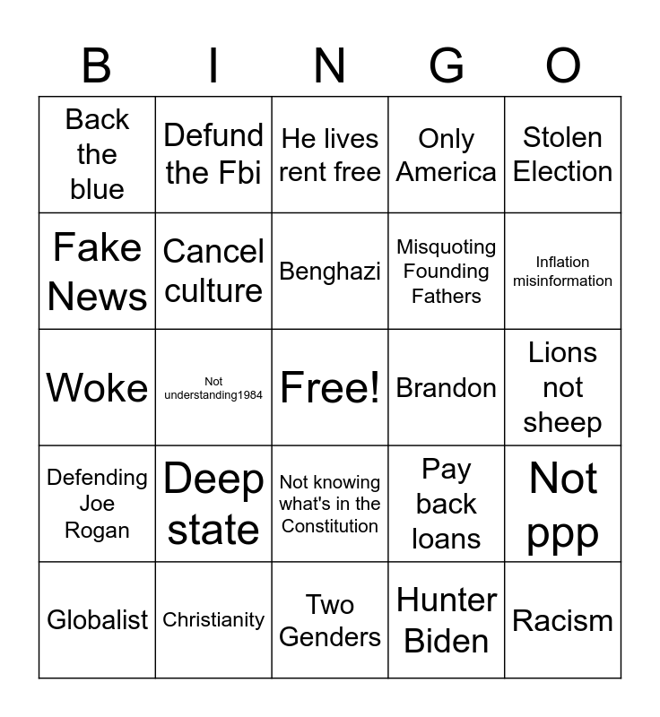 This bingo card has a free space and 24 words: Globalist, Deep state, Benghazi, Hunter Biden, Stolen Election, Back the blue, Defund the Fbi, He lives rent free, Brandon, Lions not sheep, Woke, Cancel culture, Pay back loans, Not ppp, Fake News, Christianity, Two Genders, Only America, Inflation misinformation, Defending Joe Rogan, Not understanding1984, Not knowing what's in the Constitution, Misquoting Founding Fathers and Racism.