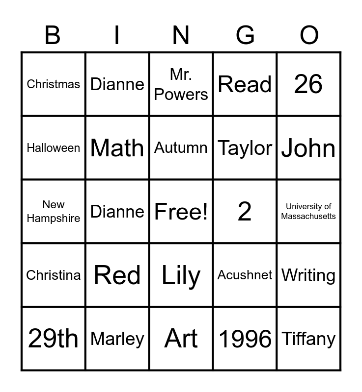 This bingo card has a free space and 24 words: Red, Marley, Autumn, 29th, 26, Christmas, Halloween, Dianne, 2, Lily, Taylor, New Hampshire, Acushnet, Writing, Math, 1996, University of Massachusetts, Mr. Powers, John, Dianne, Tiffany, Christina, Read and Art.