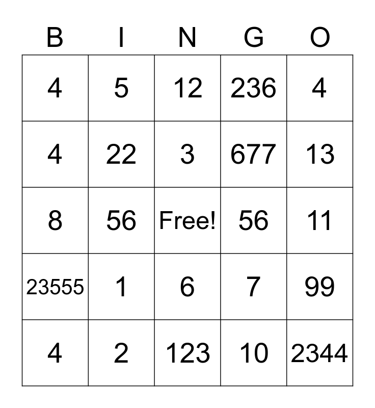 This bingo card has a free space and 24 words: 1, 2, 3, 4, 4, 4, 4, 5, 56, 6, 677, 8, 7, 99, 22, 10, 11, 12, 13, 56, 2344, 23555, 236 and 123.