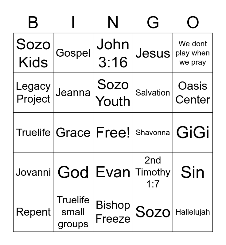 This bingo card has a free space and 24 words: God, Truelife small groups, Sozo Youth, Repent, We dont play when we pray, Sozo Kids, Legacy Project, Gospel, Shavonna, Evan, Salvation, Truelife, 2nd Timothy 1:7, Sin, Jeanna, Sozo, GiGi, John 3:16, Oasis Center, Grace, Hallelujah, Jovanni, Jesus and Bishop Freeze.