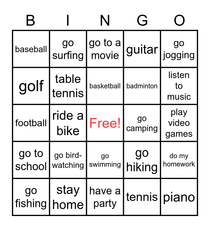 This bingo card has a free space and 24 words: go bird-watching, stay home, basketball, go fishing, go jogging, baseball, golf, go surfing, go camping, go swimming, badminton, football, go hiking, do my homework, table tennis, tennis, play video games, go to a movie, listen to music, ride a bike, piano, go to school, guitar and have a party.