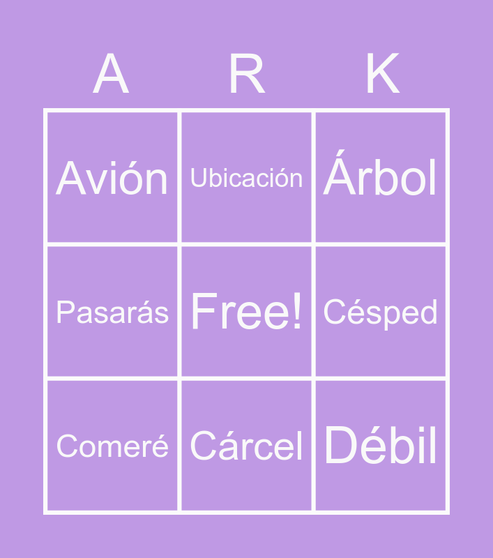 This bingo card has a free space and 11 words: Cambiará, Cárcel, Débil, Comeré, Ubicación, Árbol, Césped, Canción, Pasarás, Avión and Además.