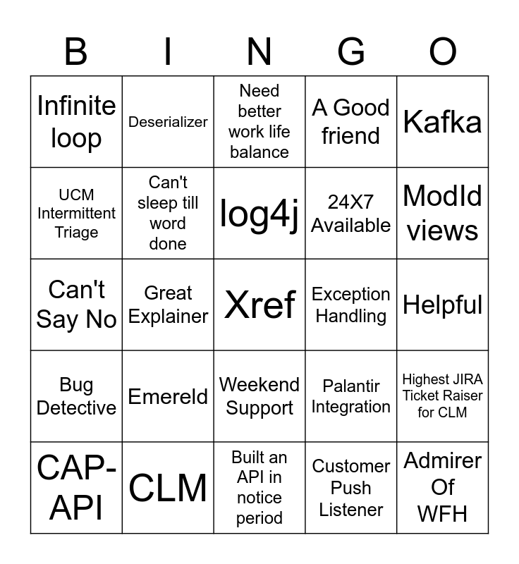 This bingo card has a free space and 24 words: Emereld, CLM, log4j, CAP-API, Kafka, Infinite loop, UCM Intermittent Triage, Deserializer, Exception Handling, Weekend Support, 24X7 Available, Can't Say No, Palantir Integration, Highest JIRA Ticket Raiser for CLM, Can't sleep till word done, Customer Push Listener, Helpful, Need better work life balance, ModId views, Great Explainer, Admirer Of WFH, Bug Detective, A Good friend and Built an API in notice period.