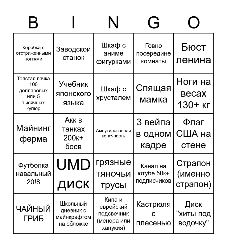 This bingo card has a free space and 24 words: UMD диск, Школьный дневник с майнкрафтом на обложке, Шкаф с хрусталем, ЧАЙНЫЙ ГРИБ, Бюст ленина, Коробка с отстриженными ногтями, Толстая пачка 100 долларовых или 5 тысячных купюр, Заводской станок, 3 вейпа в одном кадре, грязные тяночьи трусы, Спящая мамка, Майнинг ферма, Канал на ютубе 50к+ подписчиков, Страпон (именно страпон), Учебник японского языка, Кастрюля с плесенью, Флаг США на стене, Шкаф с аниме фигурками, Ноги на весах 130+ кг, Акк в танках 200к+ боев, Диск "хиты под водочку", Футболка навальный 20!8, Говно посередине комнаты and Кипа и еврейский подсвечник (менора или ханукия).