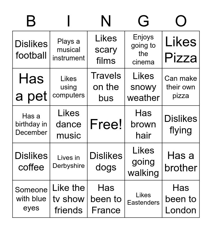 This bingo card has a free space and 24 words: Someone with blue eyes, Lives in Derbyshire, Travels on the bus, Likes Eastenders, Likes Pizza, Dislikes football, Plays a musical instrument, Likes scary films, Has brown hair, Dislikes flying, Has a birthday in December, Likes using computers, Likes going walking, Has a brother, Has a pet, Like the tv show friends, Has been to France, Enjoys going to the cinema, Can make their own pizza, Dislikes coffee, Likes dance music, Dislikes dogs, Likes snowy weather and Has been to London.