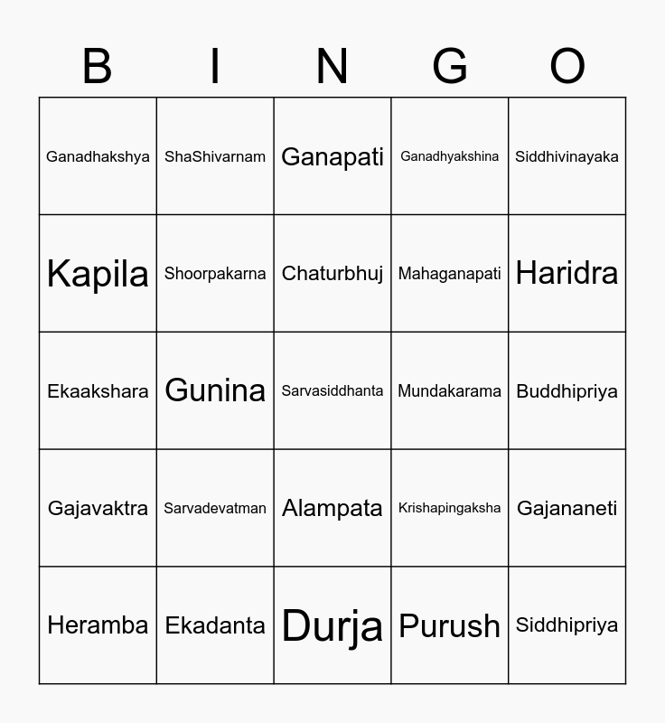 This bingo card has 91 words: Free!, Akhurath, Alampata, Anantachidrupamayam, Amit, Avaneesh, Avighna, Balaganapati, Bhalchandra, Bheema, Bhupati, Bhuvanpati, Buddhinath, Buddhipriya, Buddhividhata, Chaturbhuj, Devadeva, Devantakanashakarin, Devavrata, Devendrashika, Dharmik, Dhoomravarna, Durja, Dvaimatura, Ekaakshara, Ekadanta, Ekadrishta, Eshanputra, Gadadhara, Gajakarna, Gajanana, Gajananeti, Gajavakra, Gajavaktra, Ganadhakshya, Ganadhyakshina, Ganapati, Gaurisuta, Gunina, Haridra, Heramba, Kapila, Kaveesha, Kriti, Kripalu, Krishapingaksha, Kshamakaram, Kshipra, Lambakarna, Lambodara, Mahabala, Mahaganapati, Maheshwaram, Mangalamurti, Manomay, Mrityuanjaya, Mundakarama, Muktidaya, Musikvahana, Nadapratithishta, Namasthetu, Nandana, Nideeshwaram, Omkara, Pitambara, Pramoda, Prathameshwara, Purush, Rakta, Rudrapriya, Sarvadevatman, Sarvasiddhanta, Sarvatman, Hambhavi, ShaShivarnam, Shoorpakarna, Shuban, Shubhagunakanan, Shweta, Siddhidhata, Siddhipriya, Siddhivinayaka, Skandapurvaja, Sumukha, Sureshwaram, Swaroop, Tarun, Uddanda, Umaputra, Vakratunda and Varaganapati.