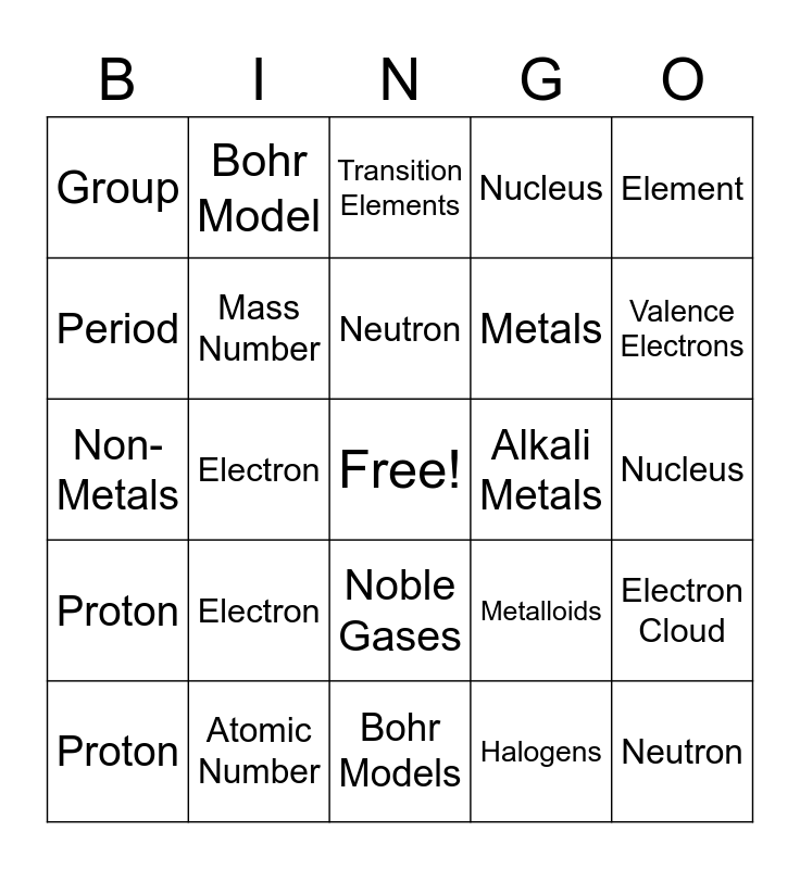 This bingo card has a free space and 24 words: Electron, Atomic Number, Neutron, Proton, Element, Group, Period, Bohr Model, Alkali Metals, Noble Gases, Metals, Non-Metals, Metalloids, Electron Cloud, Mass Number, Halogens, Nucleus, Transition Elements, Valence Electrons, Electron, Neutron, Proton, Nucleus and Bohr Models.