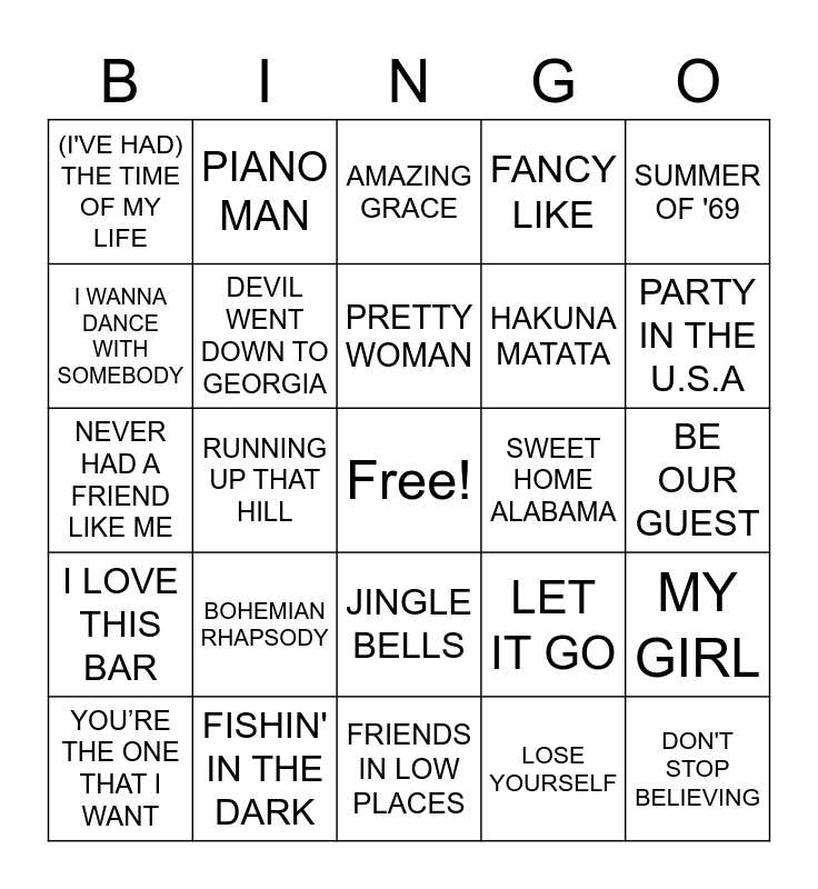 This bingo card has a free space and 50 words: SWEET CAROLINE, DON'T STOP BELIEVING, BEFORE HE CHEATS, FRIENDS IN LOW PLACES, BOHEMIAN RHAPSODY, MAN! I FEEL LIKE A WOMAN, PIANO MAN, UNDER THE SEA, I WANNA DANCE WITH SOMEBODY, PONTOON, DEVIL WENT DOWN TO GEORGIA, FANCY LIKE, MY GIRL, LET IT GO, MARGARITAVILLE, GIRLS JUST WANT TO HAVE FUN, PRETTY WOMAN, SWEET HOME ALABAMA, BROWN EYED GIRL, SUMMER OF '69, RUNNING UP THAT HILL, LOSE YOURSELF, (I'VE HAD) THE TIME OF MY LIFE, HAKUNA MATATA, OVER THE RAINBOW, GOOD 4 U, PARTY IN THE U.S.A, BELIEVER, AMAZING GRACE, JINGLE BELLS, ICE, ICE BABY, AMERICAN PIE, THE SOUND OF SILENCE, RING OF FIRE, FISHIN' IN THE DARK, TOES, HEADS CAROLINE, TAILS CALIFORNIA, COUNTRY BOY CAN SURVIVE, WHEN IT RAINS, IT POURS, BE OUR GUEST, ROCKET MAN, TENNESSEE WHISKEY, POUR SOME SUGAR ON ME, SWEET CHILD O’ MINE, YOU’RE THE ONE THAT I WANT, NEVER HAD A FRIEND LIKE ME, KOKOMO, CRUISE, I LOVE THIS BAR and FOOTLOOSE.