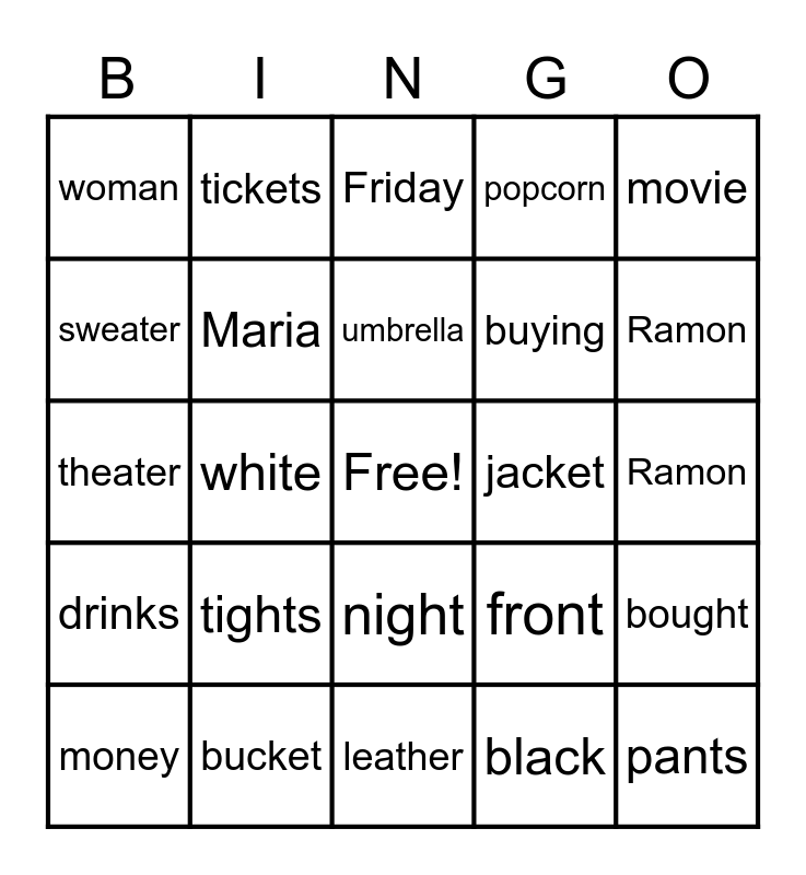 This bingo card has a free space and 24 words: money, tights, umbrella, black, movie, woman, tickets, Friday, jacket, Ramon, theater, Maria, front, bought, sweater, bucket, leather, popcorn, Ramon, drinks, white, night, buying and pants.