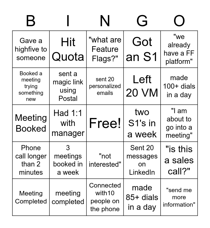 This bingo card has a free space and 29 words: Meeting Completed, Got an S1, Had 1:1 with manager, Completed 15five, Gave a highfive to someone, "what are Feature Flags?", sent a magic link using Postal, 3 meetings booked in a week, two S1's in a week, meeting completed, "I am about to go into a meeting", "send me more information", Connected with10 people on the phone, made 85+ dials in a day, made 100+ dials in a day, sent 40+ emails, "not interested", Phone call longer than 2 minutes, "we already have a FF platform", Meeting Booked, Sent 20 messages on LinkedIn, Hung up on me, Left 20 VM, Booked a meeting trying something new, Got an S1, Hit Quota, "is this a sales call?", sent 20 personalized emails and "how did you get my number?".