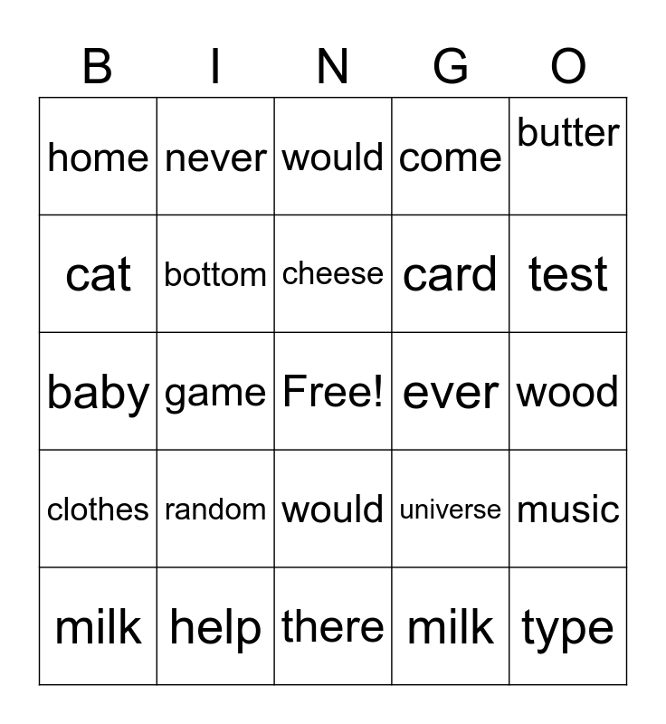 This bingo card has a free space and 24 words: random, help, cheese, milk, butter, home, cat, never, ever, would, card, baby, universe, music, bottom, milk, wood, would, test, game, type, clothes, come and there.