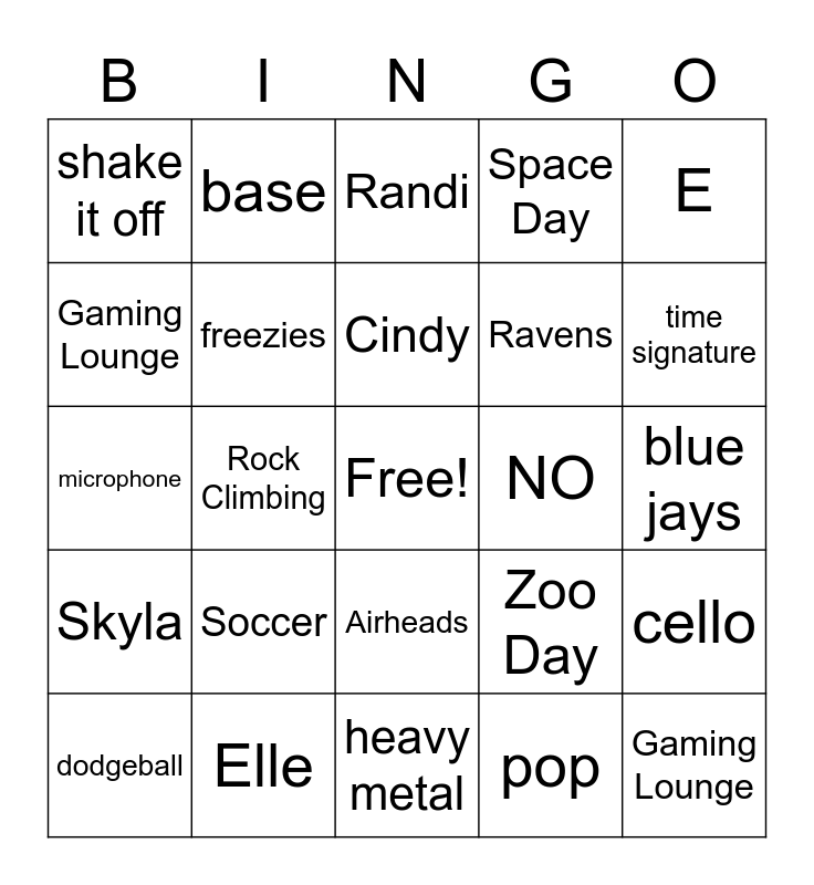 This bingo card has a free space and 188 words: poison rhythm, strum, red, snap, clap, clap, base, soprano, tambourine, conductor, orchestra, CD, Walkie Talkie, Walk in the halls, NO, Can we have ice to gym 1?, Airheads, Candy Day, Just Dance, sound, hip hop, band, trio, flute, cello, opera, duet, musical bingo, taylor swift, electric, CD, duet, listen, tempo, Freezies, dance, beat, note, flute, xylophone, snap, sing, band, hear, t swizzle, pop, accordion, drums, Kamoya, cello, shake it off, gym, rock climbing, campers choice, basketball, volleyball, sound, dodgeball, baseball, blue jays, freezies, Chef Jason, Cleanest Cubby, Blue Jays, Orioles, Ravens, Games Room, Gaming Lounge, Leadership Lounge, Rock Climbing, Craft Room, Computer Lounge, Soccer, Capture the Flag, Rain Day, Kamika, E, Colton, recorder, solo, sing, rest, sound, encore, harmony, catch me if you can, ballad, time signature, band, snap, microphone, maracas, opera, cello, note, disco, symphony, Nic, Jujar, Elle, Snack Shack, Bake Sale, Zoo Day, Water Day, Campers' Choice, Cindy, Pizza Day, Owls, Swans, Eagles, Eye Spy, Randi, Alisha, Carissa, Courtney, balloon, fun, Skyla, Julianna, Sam, Leadership Lounge, Rock Climbing, Craft Room, Computer Lounge, Soccer, Capture the Flag, Rain Day, Kamika, E, Colton, Nic, Jujar, Elle, Snack Shack, Bake Sale, Zoo Day, Water Day, Space Day, Dino Day, Fear Factor Day, choral,, electric,, heavy metal, harmony., DDR, disco, hear, folk, base, blues guitar, rhythm, stage, just dance, heavy metal, rap, triangle, microphone, Cleanest Cubby, Water Cup, ballad,, tempo,, lyrics,, listen, musical bingo, folklore, choral, lyrics, kids bop, fold, group, CD, Record, Spot it, Baking, Cooking, Beading, Colouring, Talent Show, baseball, blue jays, freezies, Chef Jason, Kamoya, Games Room, Gaming Lounge, Kamoya, Becca and challenges.