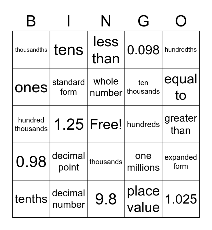 This bingo card has a free space and 24 words: decimal point, decimal number, whole number, tenths, hundredths, thousandths, ones, tens, hundreds, thousands, ten thousands, hundred thousands, one millions, expanded form, standard form, place value, greater than, less than, equal to, 1.25, 1.025, 0.98, 0.098 and 9.8.