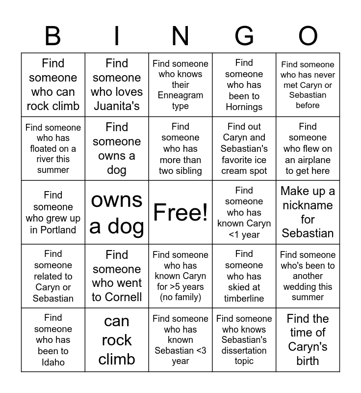 This bingo card has a free space and 30 words: can rock climb, knows their enneagram type, owns a dog, knows Caryn for over 5 years (not related, Find someone who can rock climb, Find someone who knows their Enneagram type, Find someone owns a dog, Find someone who has known Caryn for >5 years (no family), Find someone who has known Caryn <1 year, Find someone who has known Sebastian <3 year, Make up a nickname for Sebastian, Find the time of Caryn's birth, Find someone who knows Sebastian's dissertation topic, Find someone who has worked at a coffee shop, Find someone who flew on an airplane to get here, Find someone who came from Seattle, Find someone who has skied at timberline, Find someone related to Caryn or Sebastian, Find someone who went to Cornell, Find someone who has never met Caryn or Sebastian before, Find someone who grew up in Portland, Find someone who went to PSU, Find someone who loves Juanita's, Find out Caryn and Sebastian's favorite ice cream spot, Find someone who has floated on a river this summer, Find someone who has been to Hornings, Find someone who's been to another wedding this summer, Find someone who has been to Idaho, Find someone who has more than two sibling and Find someone who is an only child.