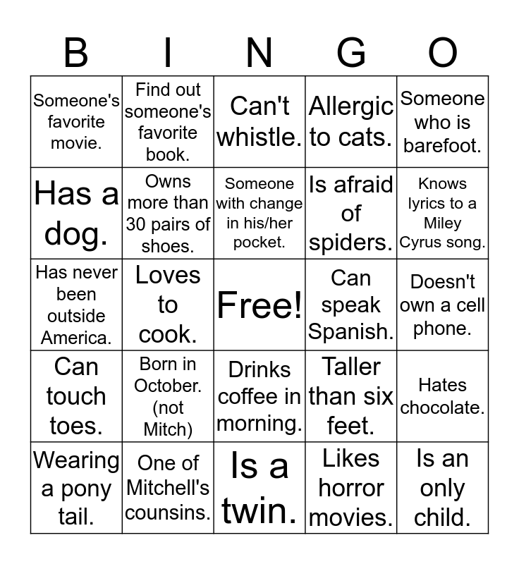 This bingo card has a free space and 24 words: Born in October. (not Mitch), One of Mitchell's counsins., Someone with change in his/her pocket., Wearing a pony tail., Someone who is barefoot., Someone's favorite movie., Has a dog., Find out someone's favorite book., Can speak Spanish., Drinks coffee in morning., Is afraid of spiders., Has never been outside America., Taller than six feet., Hates chocolate., Owns more than 30 pairs of shoes., Likes horror movies., Doesn't own a cell phone., Can't whistle., Knows lyrics to a Miley Cyrus song., Loves to cook., Is an only child., Can touch toes., Allergic to cats. and Is a twin..