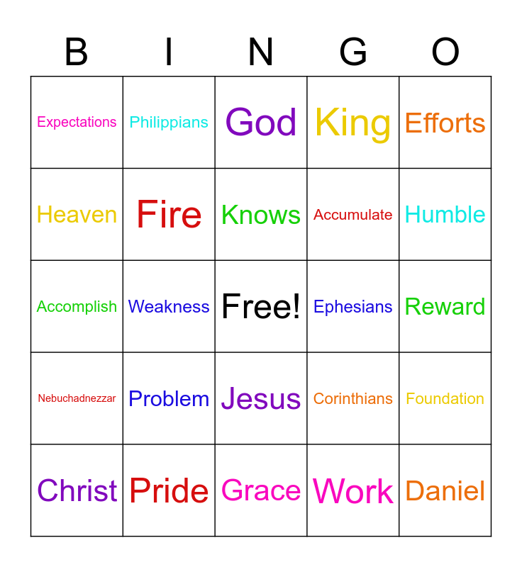 This bingo card has a free space and 24 words: Problem, Pride, Knows, Christ, Efforts, Expectations, Heaven, Philippians, Ephesians, Jesus, Accumulate, Accomplish, Corinthians, Foundation, Fire, Work, Reward, God, Humble, Weakness, Daniel, Nebuchadnezzar, King and Grace.