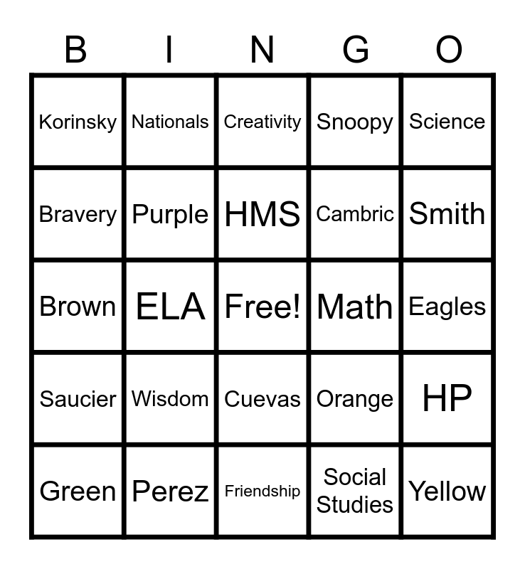 This bingo card has a free space and 24 words: Wisdom, Perez, HMS, Green, Science, Korinsky, Bravery, Nationals, Math, Cuevas, Cambric, Brown, Orange, HP, Purple, Social Studies, Eagles, Creativity, Smith, ELA, Yellow, Saucier, Snoopy and Friendship.