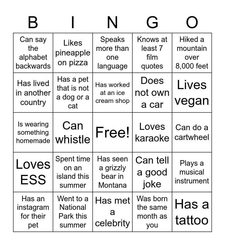 This bingo card has a free space and 24 words: Spent time on an island this summer, Went to a National Park this summer, Has worked at an ice cream shop, Has an instagram for their pet, Hiked a mountain over 8,000 feet, Can say the alphabet backwards, Has lived in another country, Likes pineapple on pizza, Loves karaoke, Has seen a grizzly bear in Montana, Does not own a car, Is wearing something homemade, Can tell a good joke, Plays a musical instrument, Has a pet that is not a dog or a cat, Was born the same month as you, Can do a cartwheel, Speaks more than one language, Lives vegan, Can whistle, Has a tattoo, Loves ESS, Knows at least 7 film quotes and Has met a celebrity.