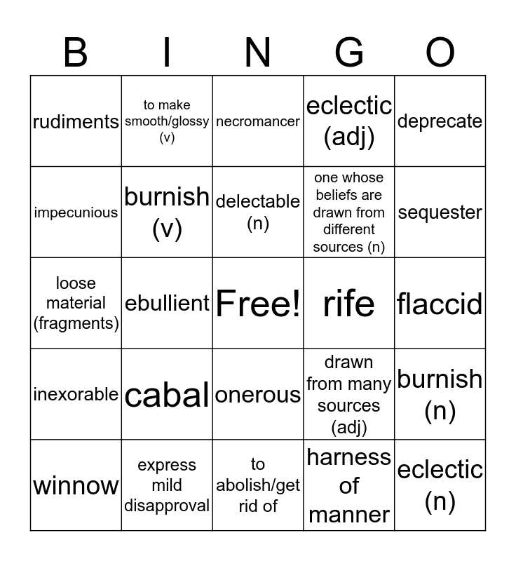 This bingo card has a free space and 37 words: abrogate, ambient, asperity, burnish (v), burnish (n), cabal, delectable (n), delectable (adj), deprecate, detritus, ebullient, eclectic (adj), eclectic (n), flaccid, impecunious, inexorable, moribund, necromancer, onerous, rife, rudiments, sequester, winnow, to abolish/get rid of, completely enveloping, harness of manner, to make smooth/glossy (v), gloss/brightness (n), small group or clique, deliciously flavored (adj), appealing/appetizing food (n), express mild disapproval, loose material (fragments), overflowing with excitement, drawn from many sources (adj), one whose beliefs are drawn from different sources (n) and limp/not firm.