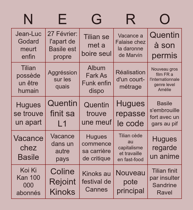 This bingo card has 25 words: Vacance chez Basile, Coline Rejoint Kinoks, Quentin trouve une meuf, Nouveau pote principal, Quentin à son permis, Jean-Luc Godard meurt enfin, 27 Février: l'apart de Basile est propre, Tilian se met a boire seul, Hugues repasse le code, Hugues regarde un anime, Tilian possède un être humain, Aggréssion sur les quais, Kinoks au festival de Cannes, Tilian cède au capitalisme et travaille en fast-food, Nouveau gros film FR a l'internationnale genre level Amélie, Koi Ki Kan 100 000 abonnés, Quentin finit sa L1, Album Fark As Funk enfin dispo, Réalisation d'un court-métrage, Basile s'embrouille fort avec un gars au pif, Hugues se trouve un apart, Vacance dans un autre pays, Hugues commence sa carrière de critique, Vacance a Falaise chez la daronne de Marvin and Tilian finit par insulter Sandrine Ravel.