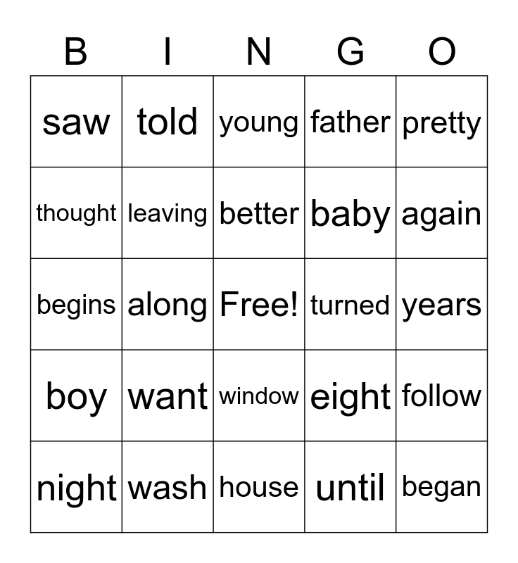 This bingo card has a free space and 24 words: want, wash, better, night, pretty, saw, thought, told, turned, window, baby, begins, eight, follow, leaving, until, years, young, again, along, began, boy, father and house.