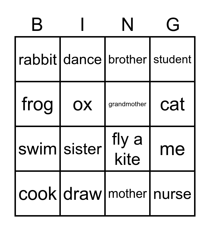 This bingo card has 25 words: Free!, bird, cat, dog, frog, rabbit, ox, dance, draw, sing, swim, fly a kite, ride a bike, grandfather, grandmother, father, mother, brother, sister, me, cook, doctor, nurse, student and teacher.